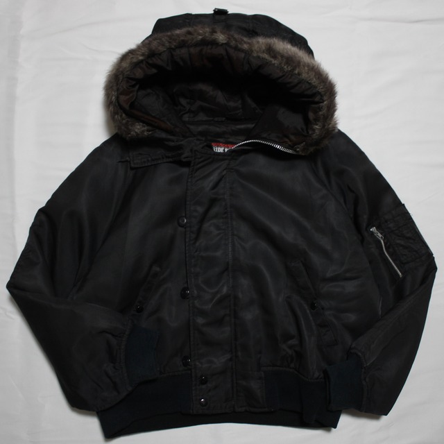 N-2Bタイプのフライトジャケット。 昨今の流行りの後押しも受け、今1番アツい形のジャケットなのではないでしょうか。 短丈でスッキリとしたスタイリングも組めますが、身幅やアクリルファーなどのボリューム感もありメリハリをしっかりと出せます。 ボディもブラックと使いやすく、汎用性の高さを伺えます。 是非この機会にお試しくださいませ。 ○素材表記 : 表記なし (おそらくナイロン) ○SIZE : Small ○COLOR : Black (ブラック) ○実寸サイズ (多少の誤差はございます) 着丈 : 57.5cm 裄丈 : 89cm 身幅 : 70cm ○商品状態 全体的な色褪せなど古着特有の着用感はございますが、汚れや破れなどの目立つダメージは見当たりません。 フード内部や内側に色抜け・色褪せがみられます。 またジッパー部分にはサビがあります。 ●写真と実物で、若干色味が異なることがございます。 ●お客様都合での返品・交換は承っておりません。 ●こちらは店頭併売商品です。店頭にて売り切れとなり、オンライン在庫数に反映されるまで若干の時間差がございます。その際、ご注文後に商品がご用意できない場合もございますのでご了承ください。 ●他の出品している商品と複数点でのご購入を希望される方はお問い合わせ下さいませ。まとめての専用ページをご用意いたしますので、そちらからのご購入をお願いいたします。