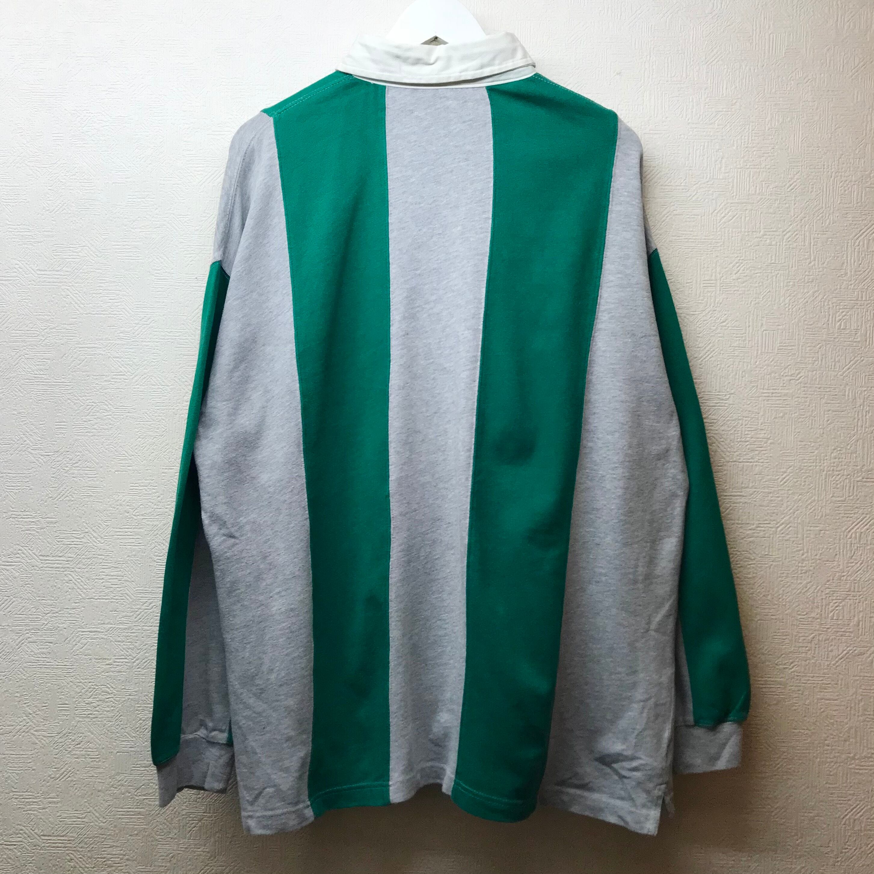 全体はカナダドライのイメージカラーでもある、グリーンのストライプ。ラガーシャツでは一般的なデザインですが、シンプルな分着やすさがありそうです。