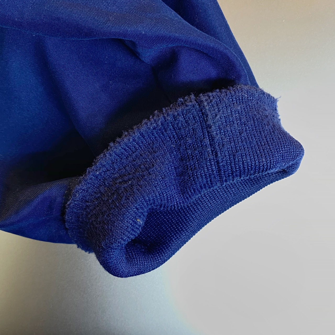 裾のリブ内側に毛羽立ち、表面に若干の小さなキズと黒シミが見られるなど、