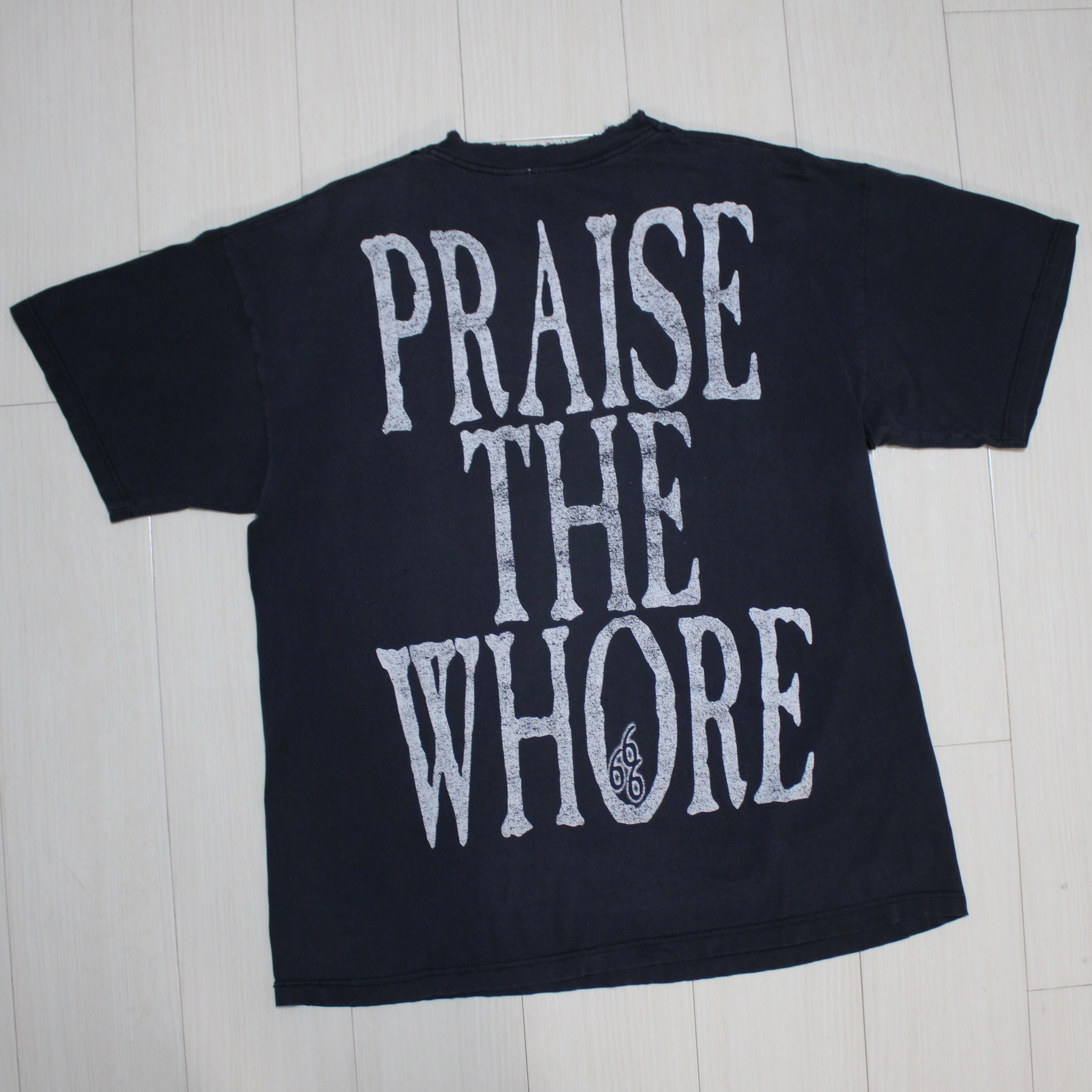 "Praise The Whore" (娼婦を讃えよ)というメッセージ性の強いプリントです。